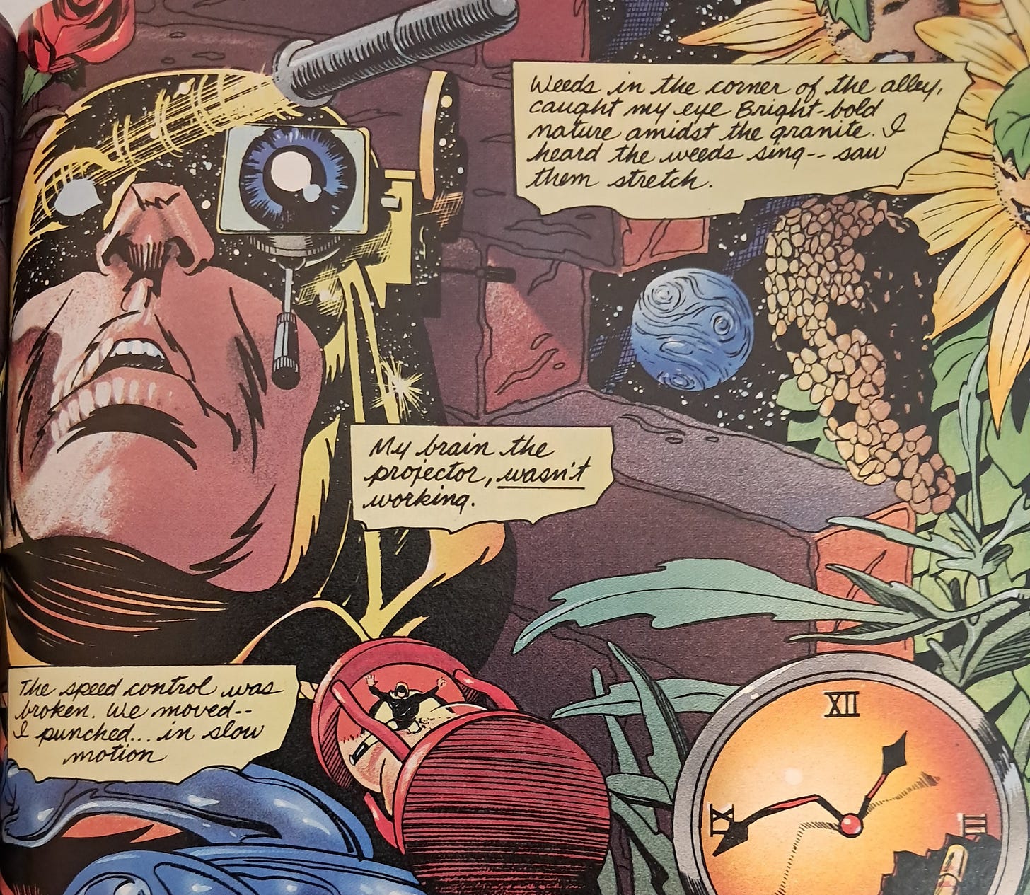 The panels are fluid and demonstrate great range. One scene employs surreal imagery to convey Hourman’s drug-fueled confusion (the excerpt above) while another evokes the rough-hewn purity and innocence of Golden Age comics (below).